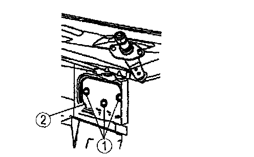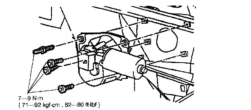 7. Remove the stud bolt and three bolts from the wiper motor.