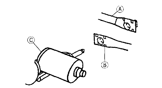 6. Disconnect the right-hand wiper mounting arm and pivot shaft (A) from the left-hand wiper mounting arm and pivot shaft (B). Move both away from the wiper motor (C).