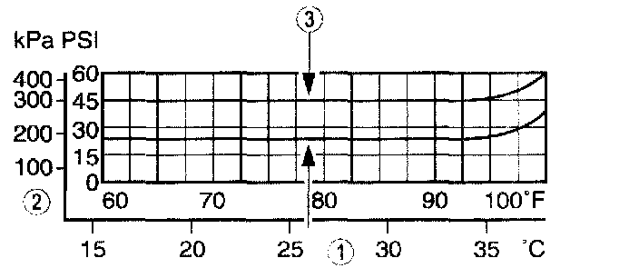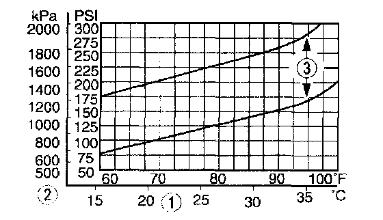 NOTE: In ambient temperatures between 38 °C - 43 °C (100 °F - 110 °F), the system performance pressures will be the same as those for ambient temperatures shown on the chart in the 32 °C - 38 °C (90 °F - 100 °F) range.