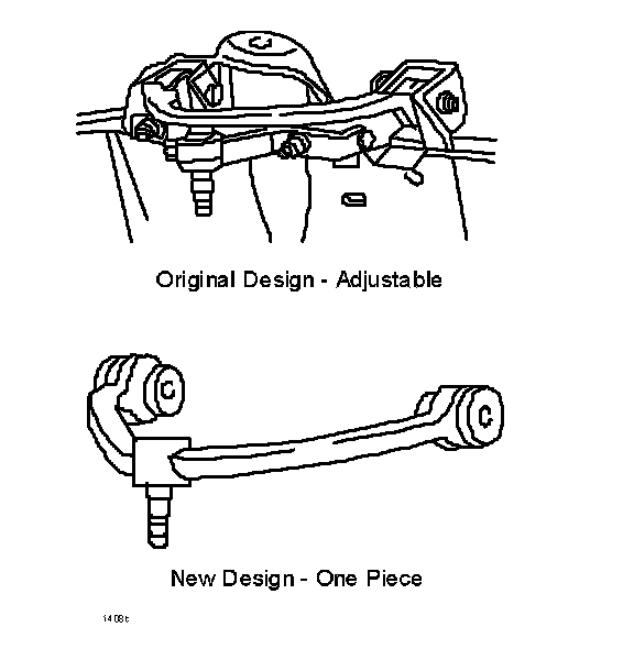 The right hand upper control arm design for torsion bar front suspensions has changed from a two piece design to a single piece design during the 2003 model year. The single piece design is now the only version of the upper control arm available for service of prior model year (1998-2003 Job 1) B-Series Trucks.