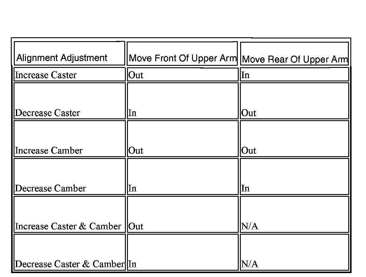 3. To adjust caster and camber refer to ALIGNMENT ADJUSTMENT CHART. Refer to Workshop Manual (section 02-11 WHEEL ALIGNMENT) for alignment specifications. Adjustments that require moving the front and rear of the upper control arm should be made equally.