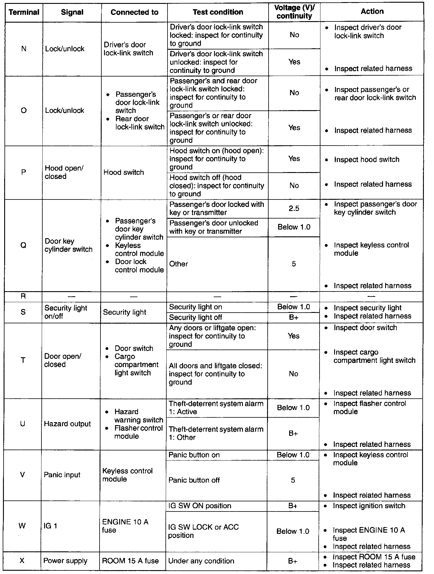 3. Disconnect the theft-deterrent control module connector before inspecting for continuity at terminals B, N, O, P, and T.