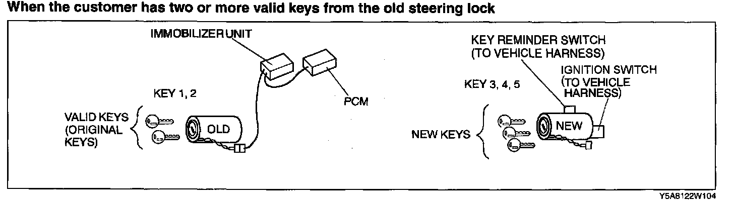 - To make a copy of the key or replace the immobilizer system component parts (the key (s), steering lock, immobilizer unit, and/or PCM), the customer should bring all keys to the dealer. This is because the previously programmed key IDs are erased when reprogramming the key IDs into the immobilizer unit and PCM.