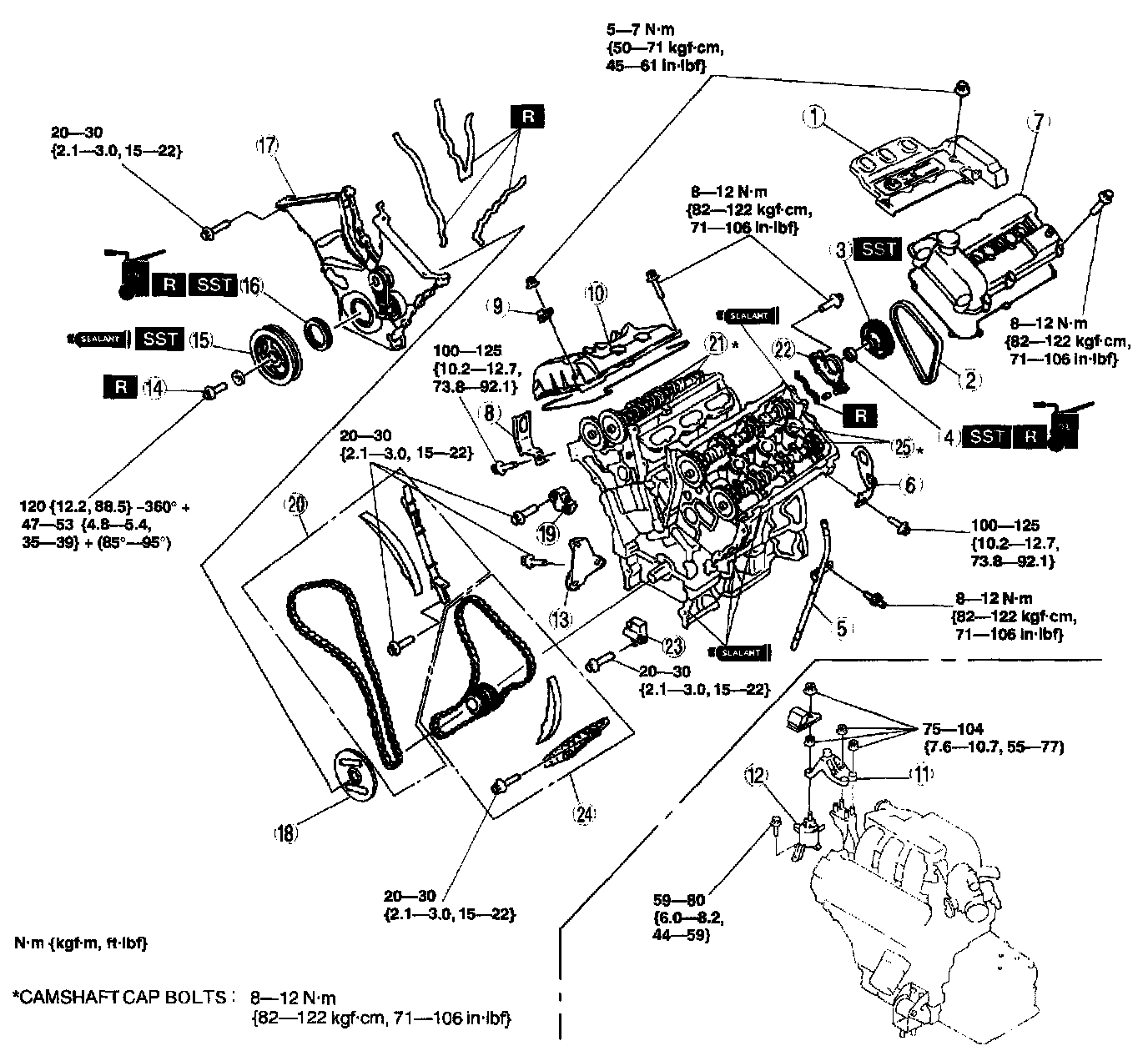 Note: After adjusting the camshaft end play using the thrust caps 1R and 5R, tighten the other bearing caps.