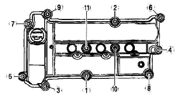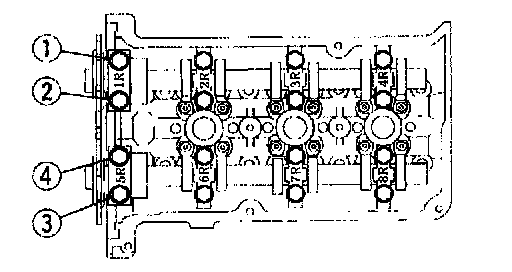 2. Loosen the remaining bolts 7-8 turns in the indicated sequence in several passes to allow the camshafts (RH) to be slowly raised.