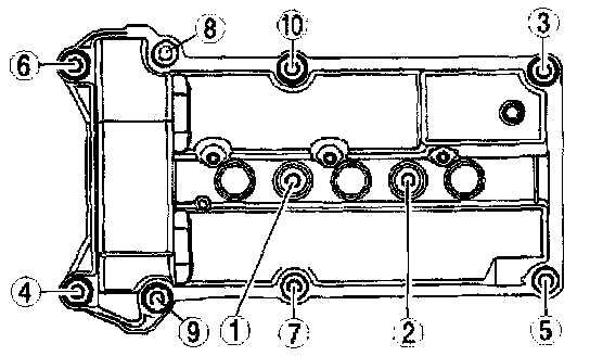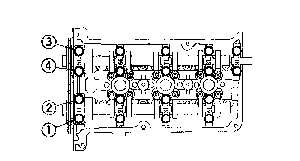 2. Loosen the remaining bolts 7-8 turns in the indicated sequence to allow the camshaft (LH) to rise.