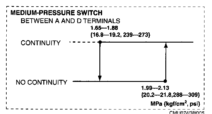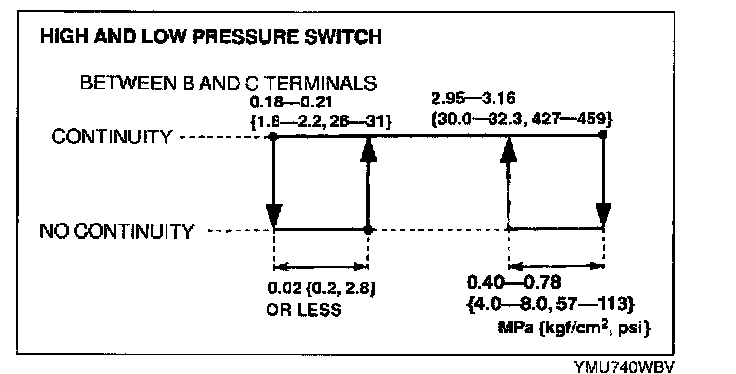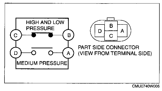 3. Verify the high-pressure side reading of the manifold gauge and continuity between the terminals B and C, and A and D is as shown.
