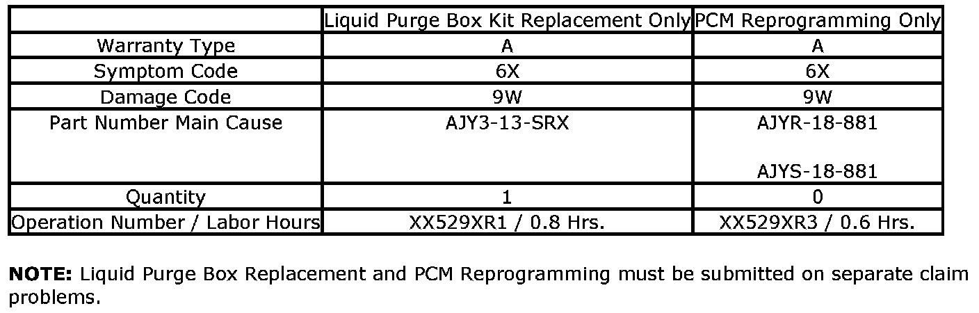 Depending on the VIN and DTCs stored in memory, installation of a LIQUID PURGE BOX KIT and/or PCM REPROGRAMMING will be necessary to repair the vehicle.