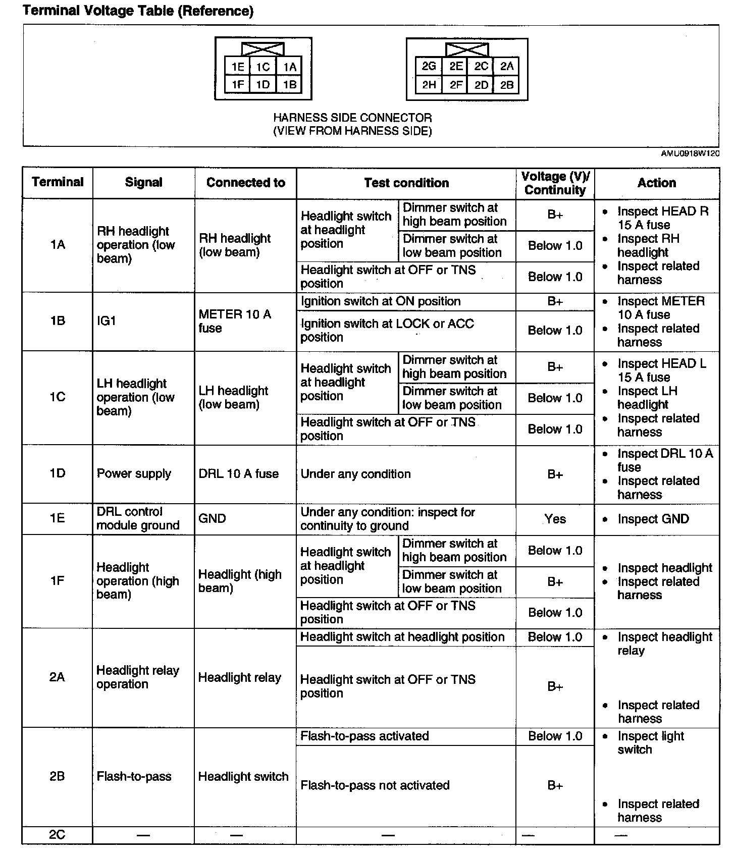 DRL CONTROL MODULE INSPECTIONTerminal Voltage Table (Reference) - Terminal (1A - 2C):
