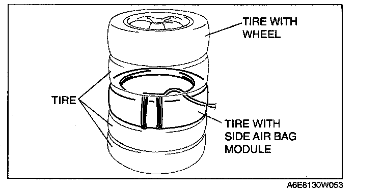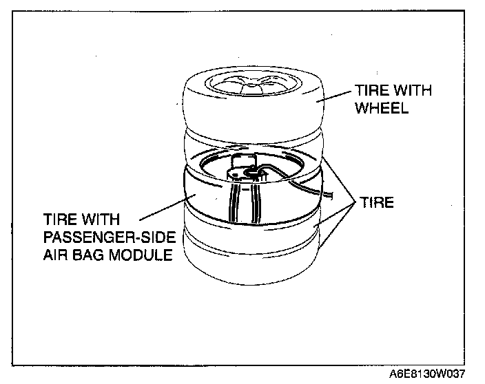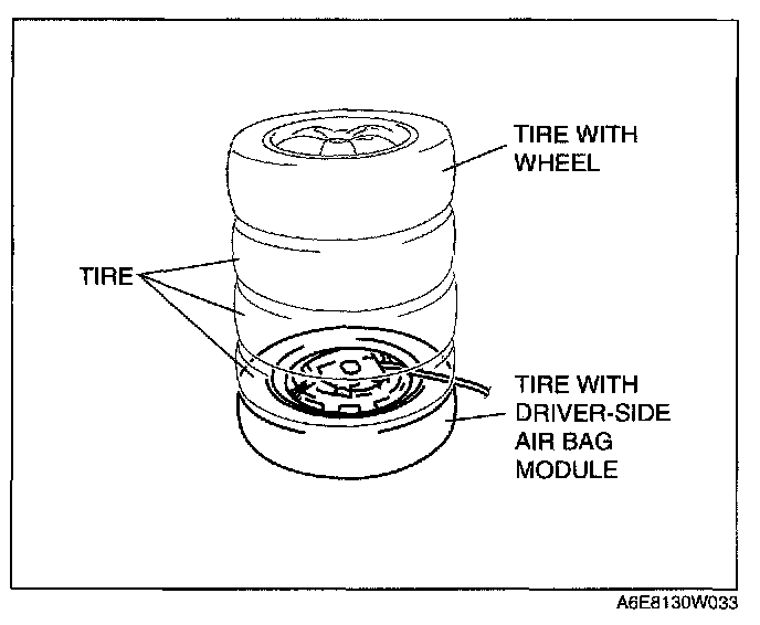 5. Stack the tire with the passenger-side air bag module on top of two tires without wheels. Stack a tire without a wheel on top of the tire with the passenger-side air bag module, and then stack another tire with a wheel on the very top.