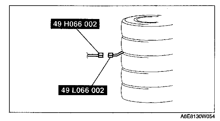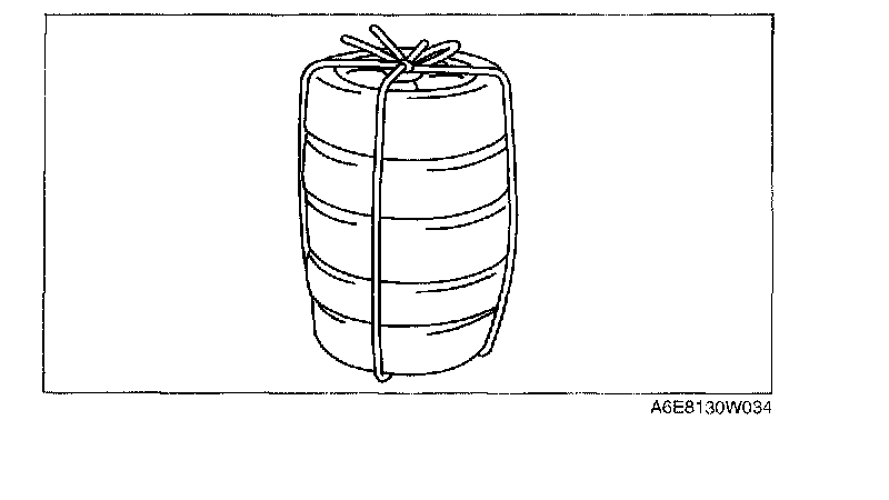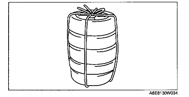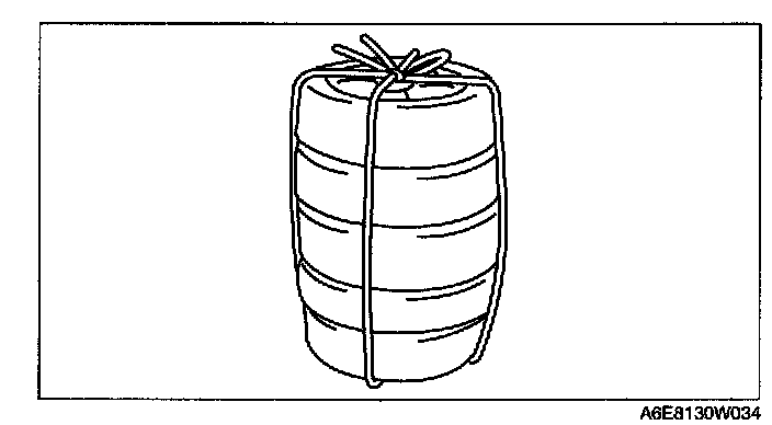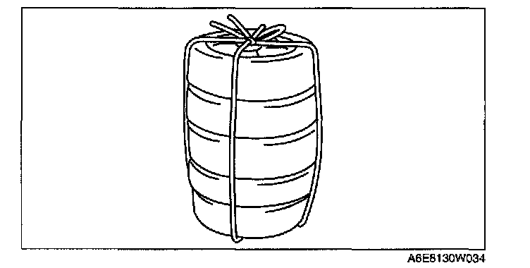 3. Put the pre-tensioner seat belt inside the tire and secure it to the tire by wrapping a wire (cross section 1.25 sq.mm {0.002 sq.in} or more) through the tire and the bolt installation holes at least 4 times.