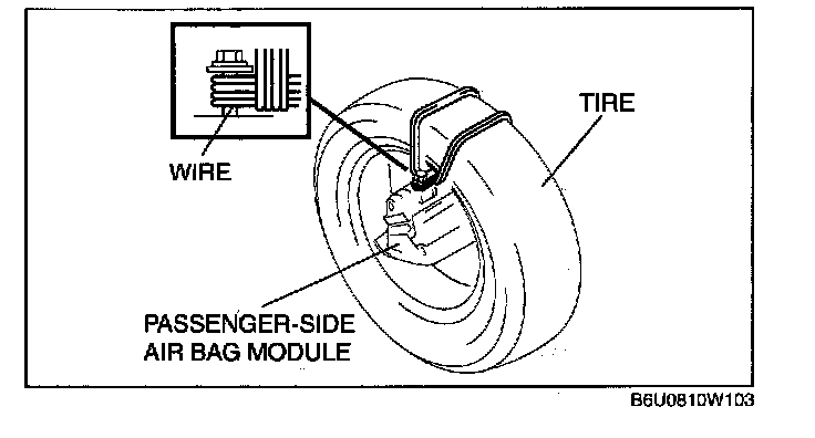 4. Place the padded surface of the passenger-side air bag module facing the center of the tire as shown in the figure. To secure the air bag module to the tire wheel, wrap a wire (cross section 1.25 sq.mm {0.002 sq.in} or more) through the tire and around the bolts at least 4 times.