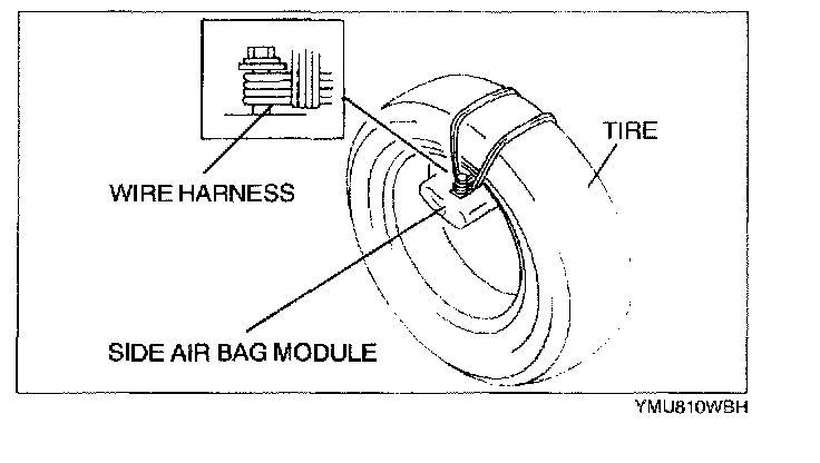 3. Place the padded surface of the side air bag module facing the center of the tire as shown in the figure. To secure the air bag module to the tire wheel, wrap a wire (cross section 1.25 sq.mm {0.002 sq.in} or more) through the tire and around the bolts at least 4 times.