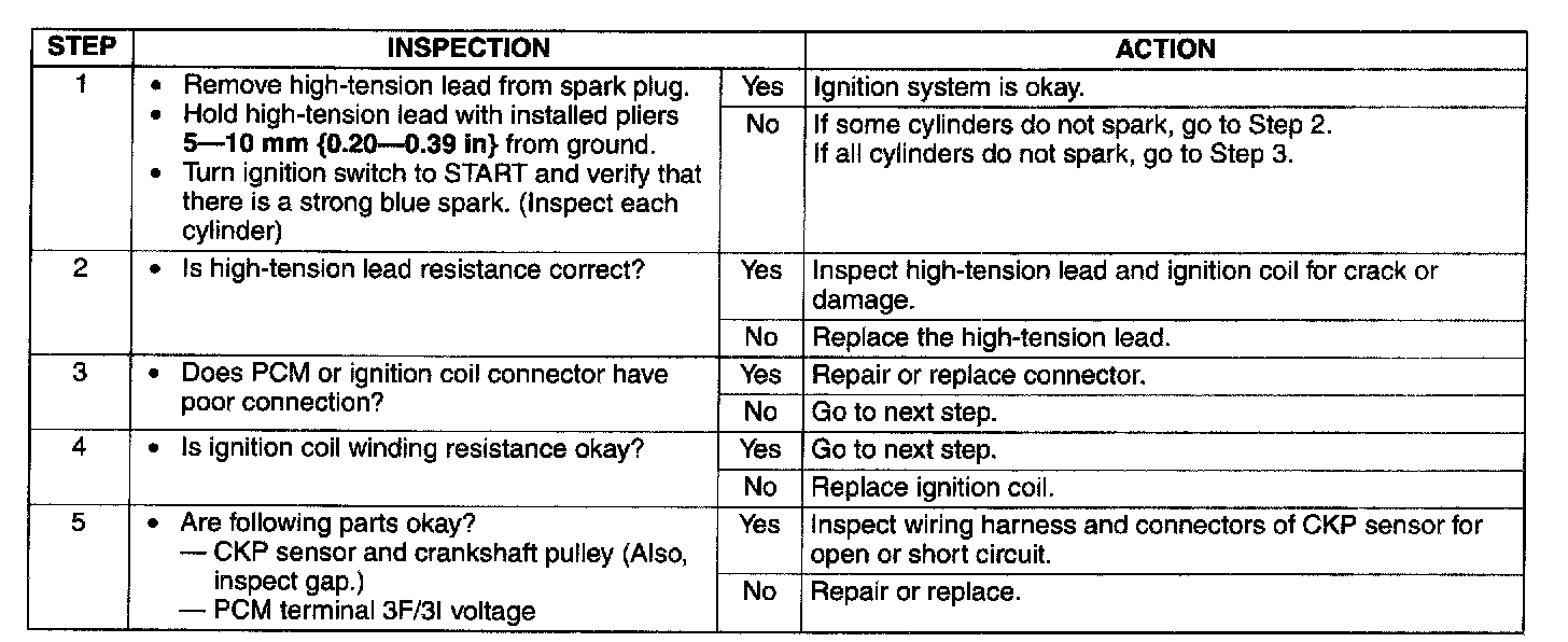 WARNING: HIGH VOLTAGE IN THE IGNITION SYSTEM CAN CAUSE STRONG ELECTRICAL SHOCK WHICH CAN RESULT IN SERIOUS INJURY. AVOID DIRECT CONTACT TO THE VEHICLE BODY DURING THE GIVEN SPARK TEST.