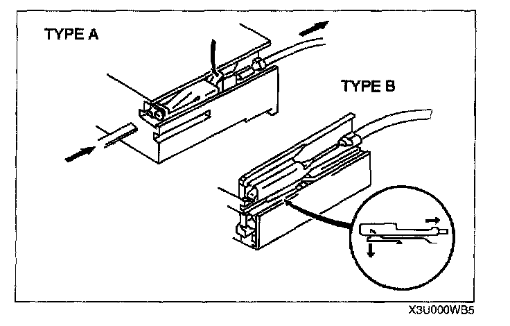 - Use the appropriate tools to remove a terminal as shown. When installing a terminal, be sure to insert it until it locks securely.