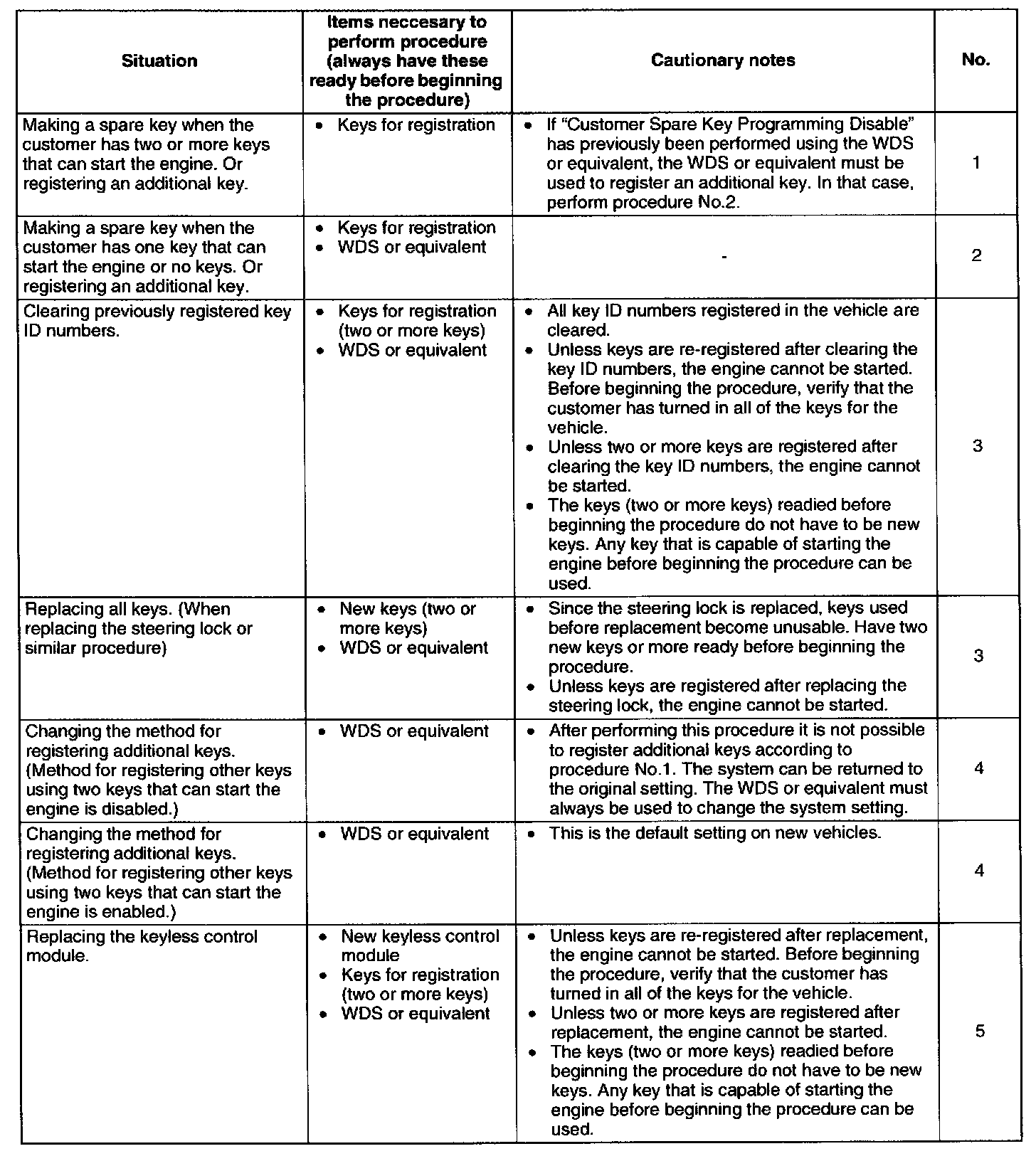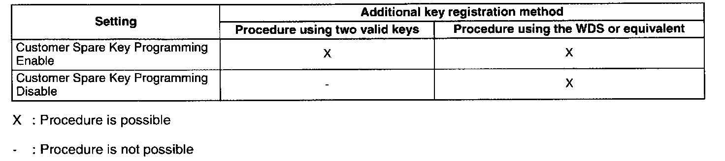 - By disabling the "No.1 Additional Key Registration Procedure (Using Two Valid Keys)", only the WDS or equivalent can be used to register additional keys, thereby preventing two valid keys from being used to create an unauthorized spare key. This function is for use by rental car or other companies with vehicle fleets.