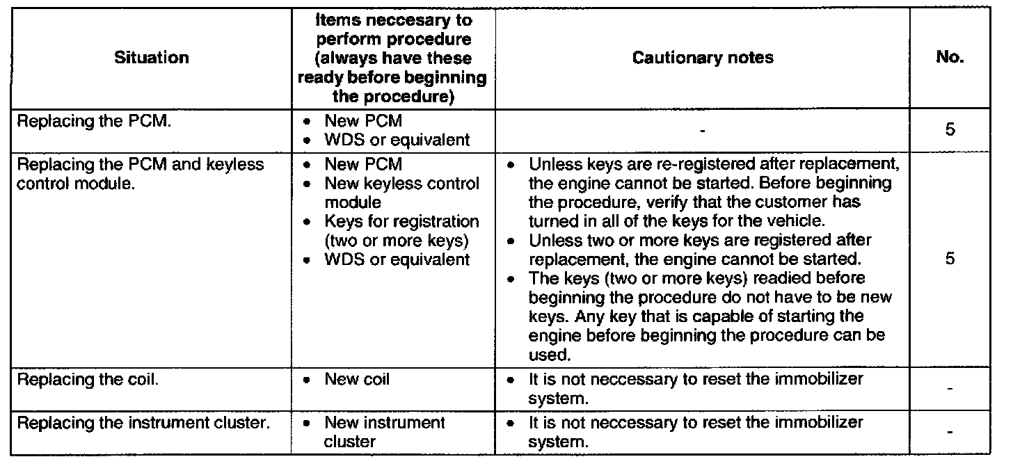 No.5 Resetting Procedure for the Immobilizer System when Replacing the PCM or Keyless Control Module Conditions