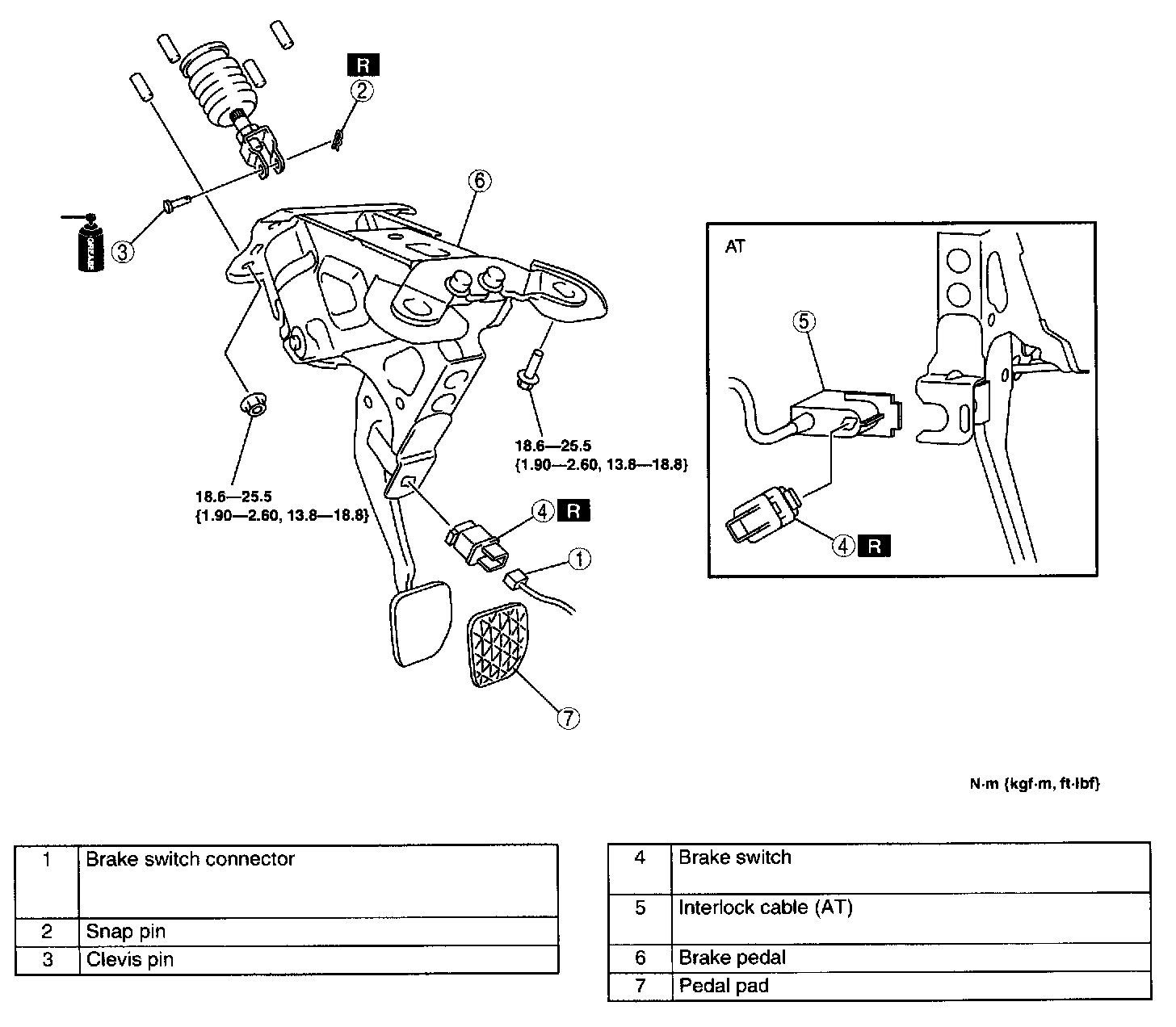 ^ When replacing the brake pedal (AT), it is possible that the installation of the interlock cable could become defective. Always refer to the interlock cable installation note when replacing the brake pedal.