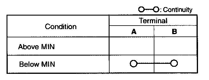 2. Inspect for continuity according to fluid level between the brake fluid level sensor terminals. If not as indicated in the table, replace the reserve tank.