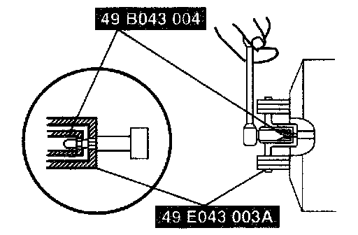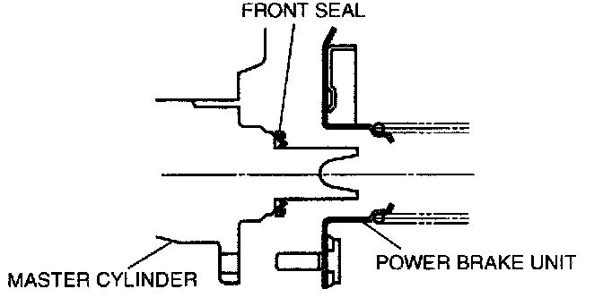 ^ After installing the master cylinder, if air still exists in the brake lines even after performing brake bleeding, brake drag occurs, or other malfunctions are present, it is possible that the master cylinder piston is jammed against the push rod retainer of the power brake unit. If air cannot be bled completely, brake drag exists, or other malfunctions occur, remove the master cylinder and reinstall it properly.