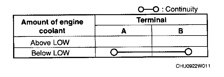 - If the continuity is not as indicated in the tables, replace the coolant reserve tank.