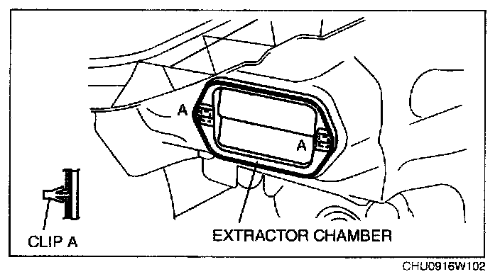 2. Detach clips A by squeezing them from inside the vehicle, and remove the extractor chamber from the body.