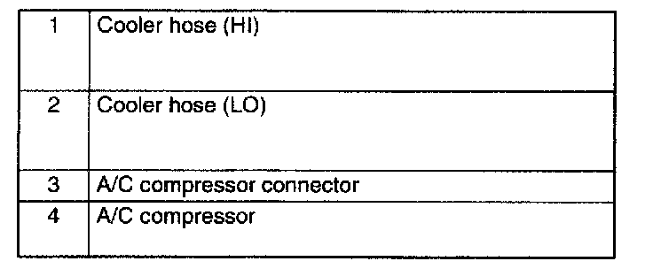 5. Do not allow remaining compressor oil in the A/C compressor and pipes to spill, and remove in the order indicated in the table.
