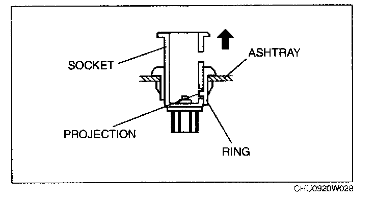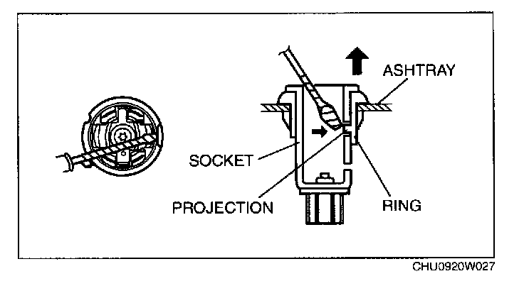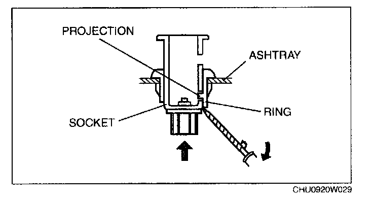 3. From the rear of the ashtray, insert a tape-wrapped flathead screwdriver between the socket and the ring as shown in the figure.