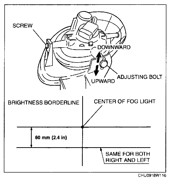 9. Loosen the screw and the adjusting bolt, move the front fog light in the direction of the arrows, and adjust the front fog light beam to the position shown in the figure.