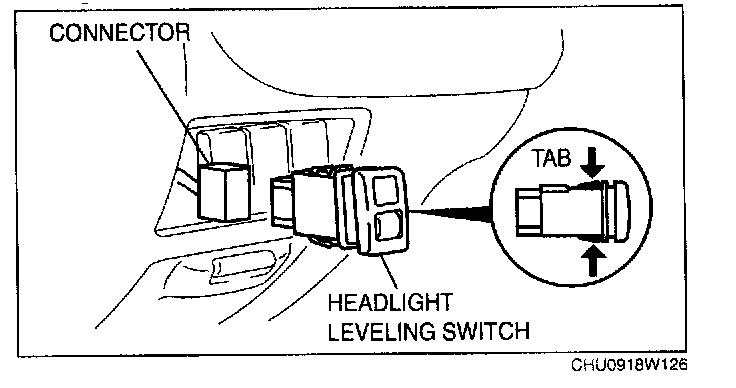 1. Reach into the dashboard through the underside of the lower panel and, while pushing on the tabs of the headlight leveling switch, pull it outward.
