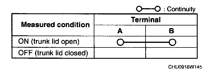 3. Verify that the continuity between the trunk compartment light switch terminals is as indicated in the table.