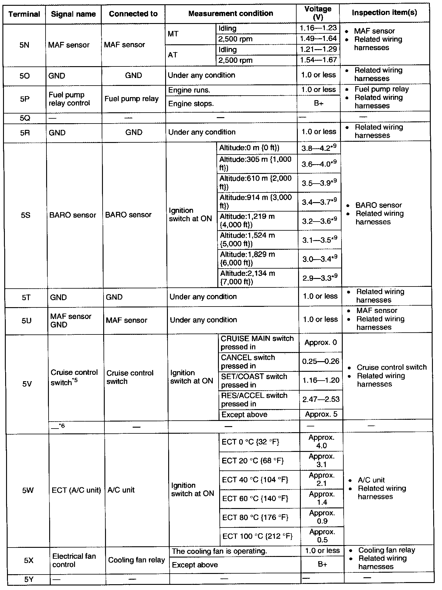 PCM Terminal Voltage Table (Reference) - Terminals (5N - 5Y):