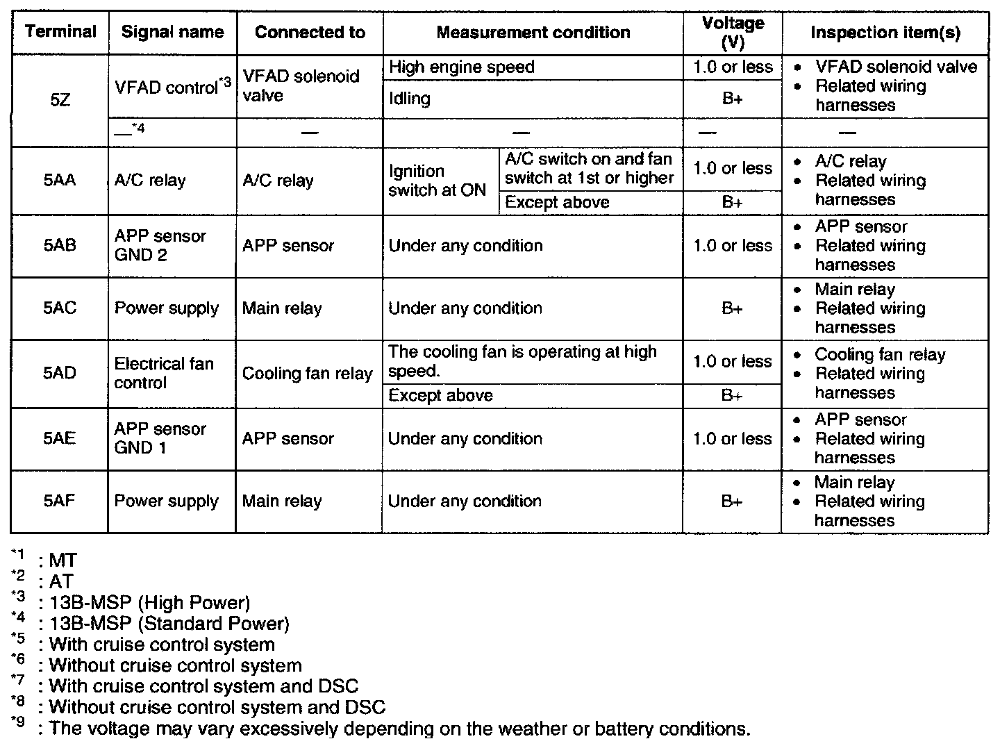 PCM Terminal Voltage Table (Reference) - Terminals (5Z - 5AF):