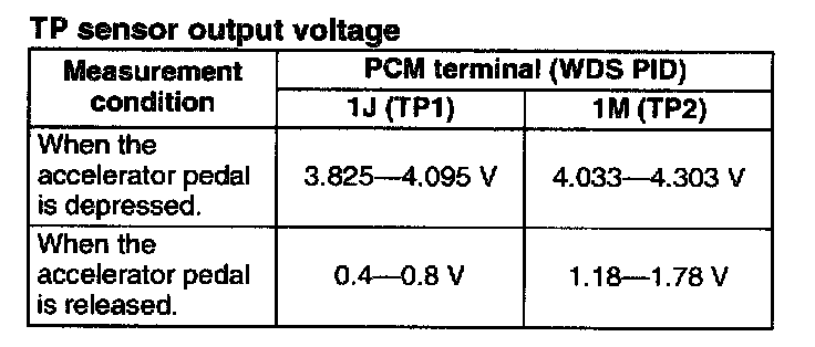 2. Verify that the voltage at PCM terminals 1 J (WDS PID: TP1) and 1 M (WDS PID: TP2) increases while gradually increasing the accelerator pedal opening angle according to the accelerator pedal opening angle.