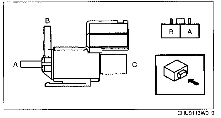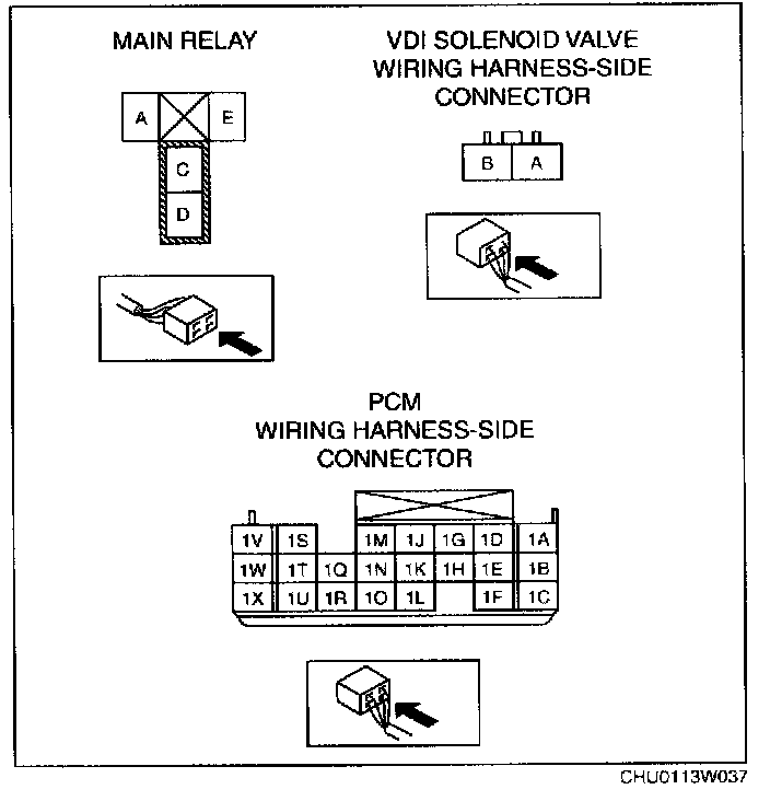 - VDI solenoid valve terminal A (harness-side) and main relay terminal C (harness-side)