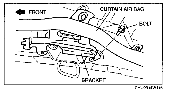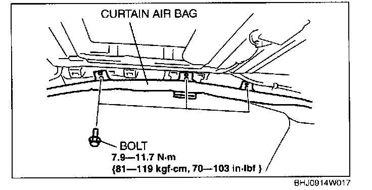 4. Remove the bolts from curtain air bag module points A.