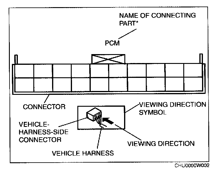 When it is necessary to show the terminal side of vehicle harness-side connectors, such as the following connectors, the viewing direction is from the terminal side.