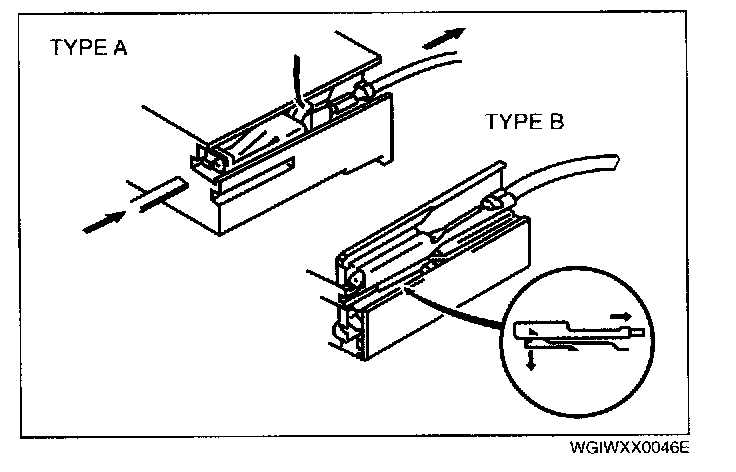 - Insert a thin piece of metal from the terminal side of the connector and with the terminal locking tab pressed down, pull the terminal out from the connector.