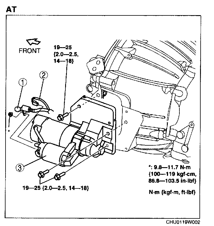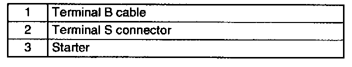STARTER REMOVAL/INSTALLATIONWARNING: When the battery cables are connected, touching the vehicle body with starter terminal B will generate sparks. This can cause personal injury, fire, and damage to the electrical components. Always disconnect the negative battery cable before performing the following operation.