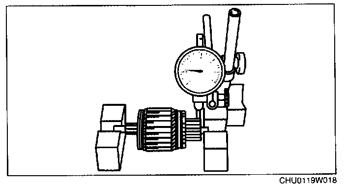 3. Place the armature on V-blocks, and measure the runout using a dial indicator.