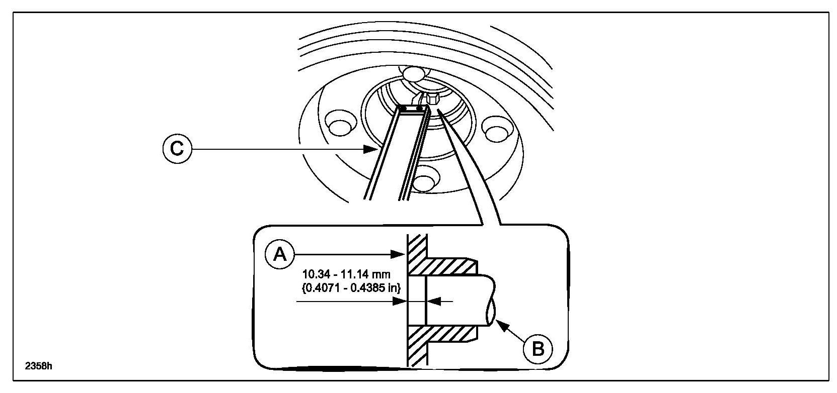 Pressing distance for the front oil seal (A) from edge of front cover (B): 1.5-2.5 mm {0.06-0.09 in}.