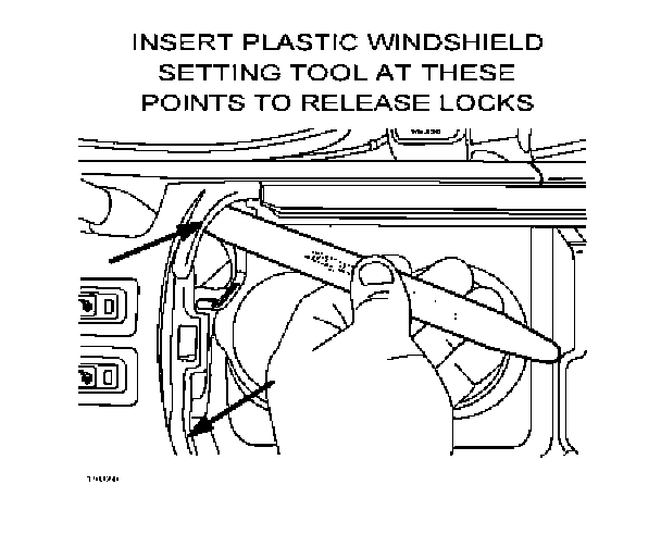 ^ Note location of locks and areas recommended to insert Plastic Windshield Setting Tool or equivalent to remove.