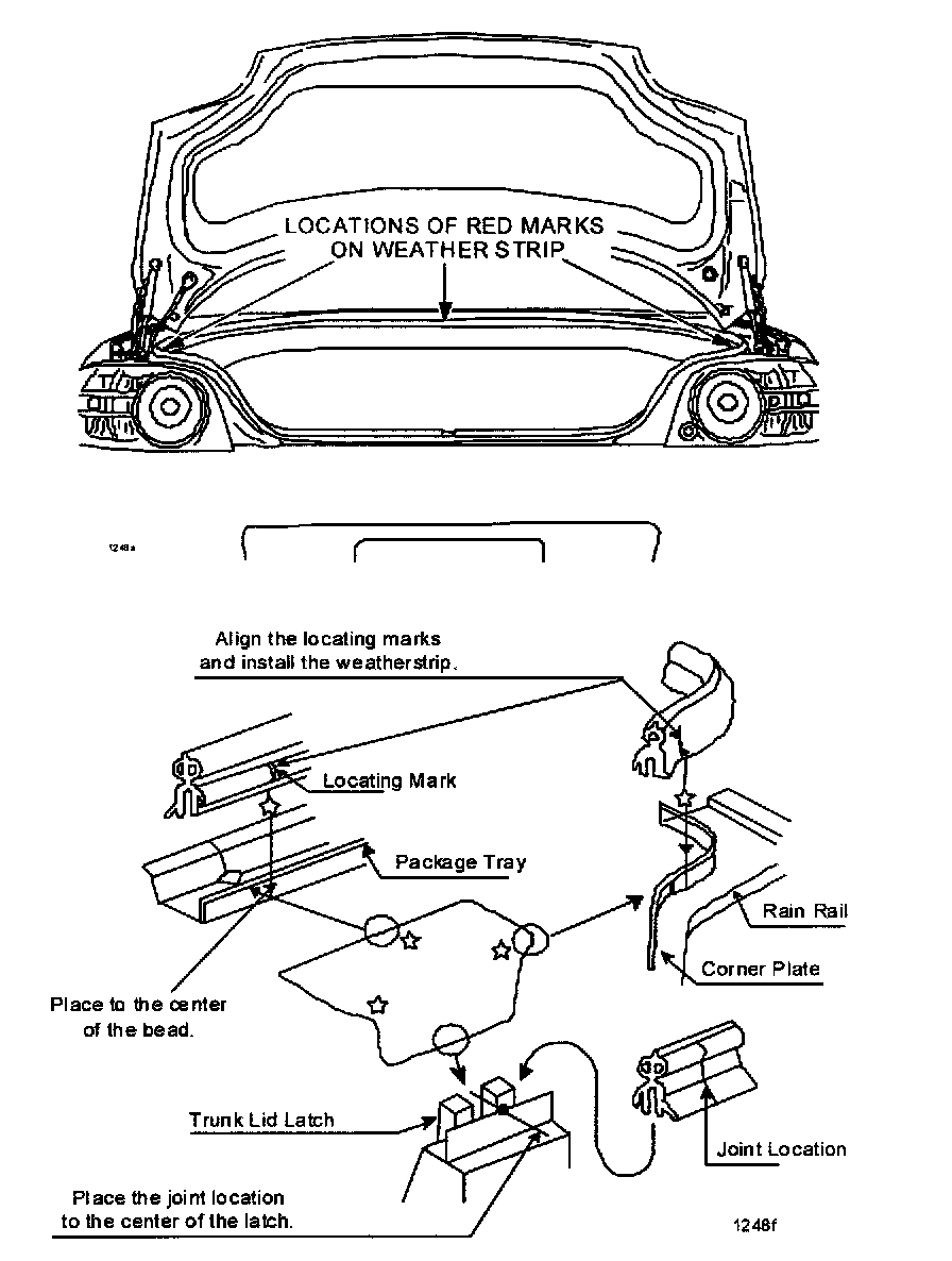 a. Note position of red marks on old trunk weather-strip prior to removal. One will be at each rear corner of trunk opening and one will be in center of trunk, near rear window. These marks will aid in installation of modified trunk weather-strip.