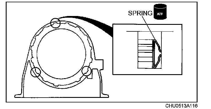 16. Align the fluid passage and install the return spring, 2-4 brake retainer, and the snap ring.
