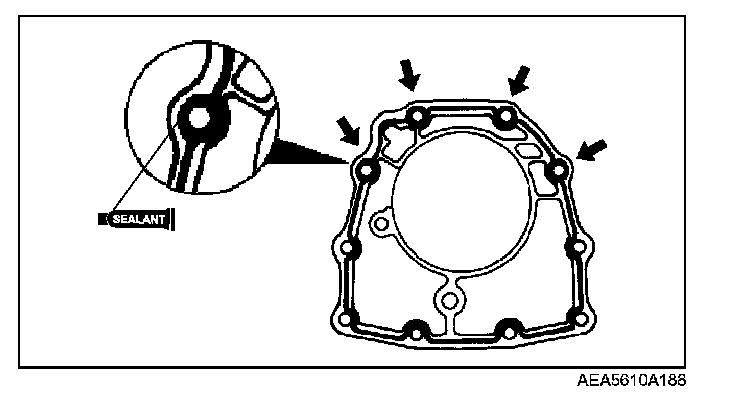 58. Apply a light coat of sealant to the contact surfaces of the transmission case and the extension housing. (For the four locations indicated in the figure, apply sealant to the entire circumference of the bolt holes.)
