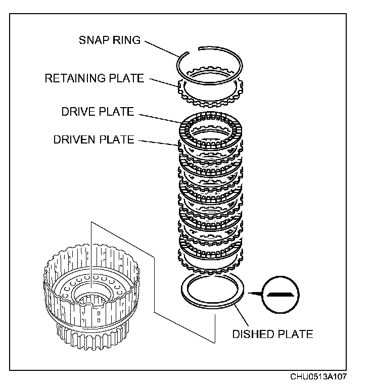 16. Install the plates and the snap ring to the low clutch drum in the following order:
