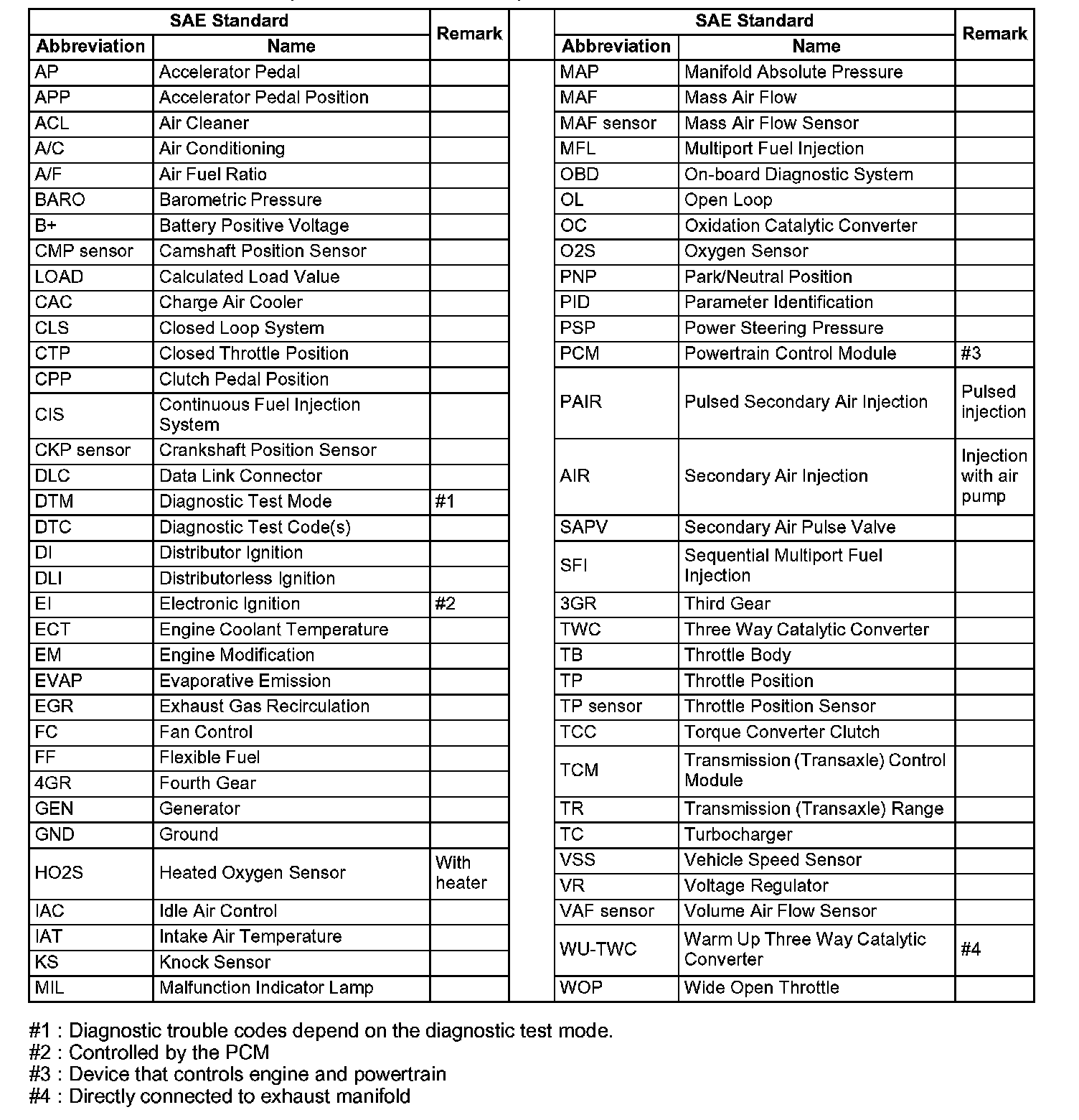 SAE STANDARDS^ In accordance with new regulations, SAE (Society of Automotive Engineers) standard names and abbreviations are now used in this information. The table below lists the names and abbreviations that have been used in Mazda information up to now and their SAE equivalents.