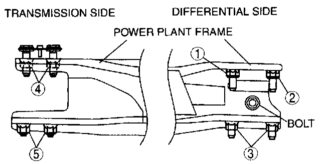 7. Tighten the nuts and bolts on the rear differential side in the order shown.