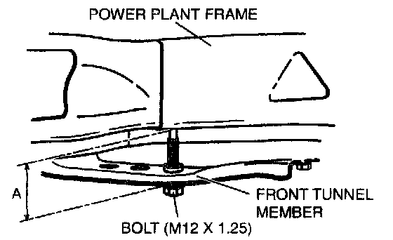 ^ When raising power plant frame without a transmission jack, use bolts with a thread length of 55 mm (2.16 inch) or more (M12 x 1.25). Tighten bolts from the underside of the front tunnel member and raise power plant frame.