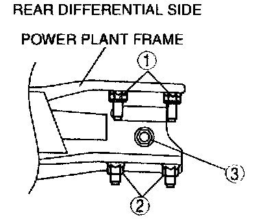 4. Tighten nut 1 until the power plant frame is seated in the rear differential.